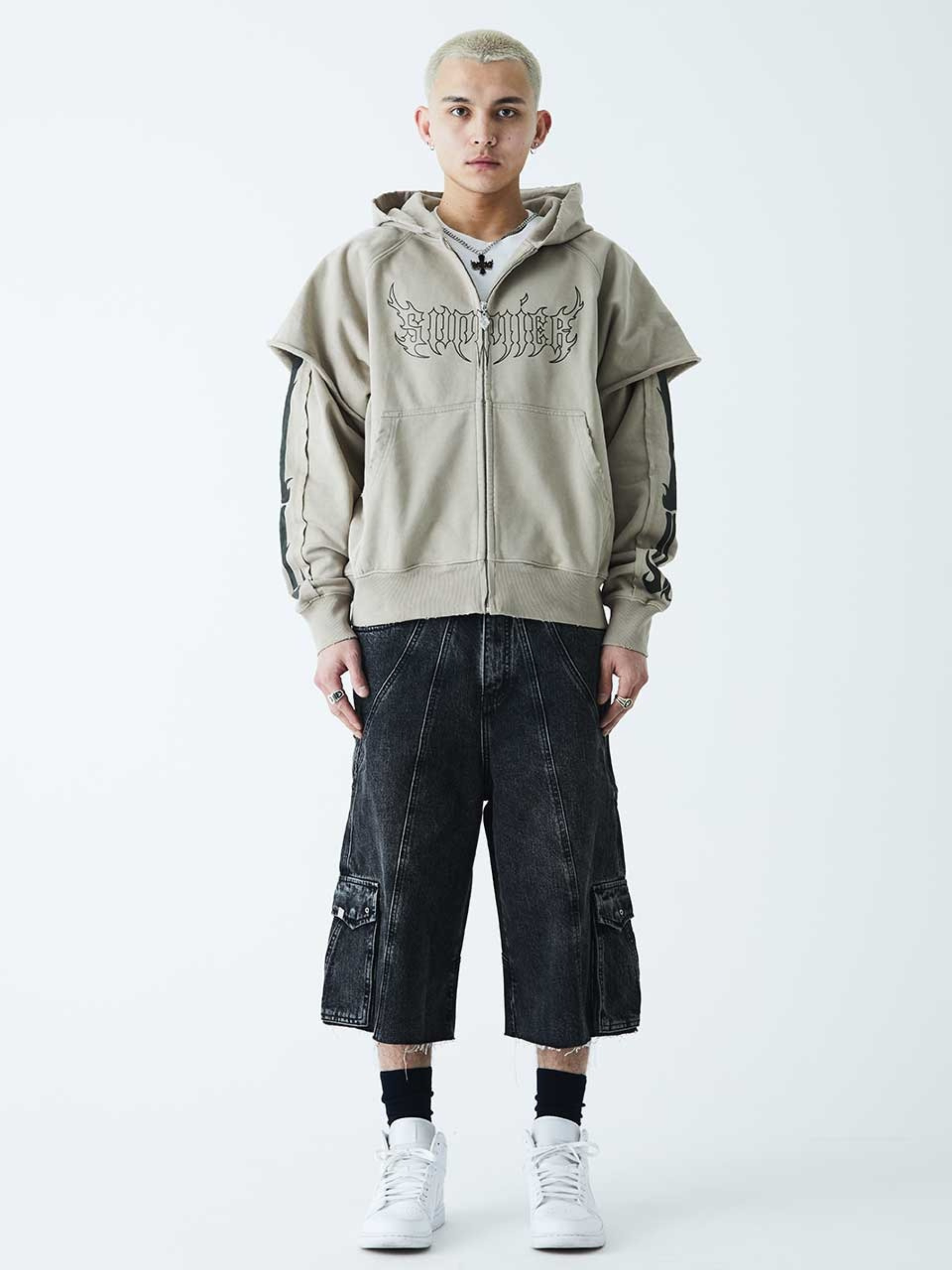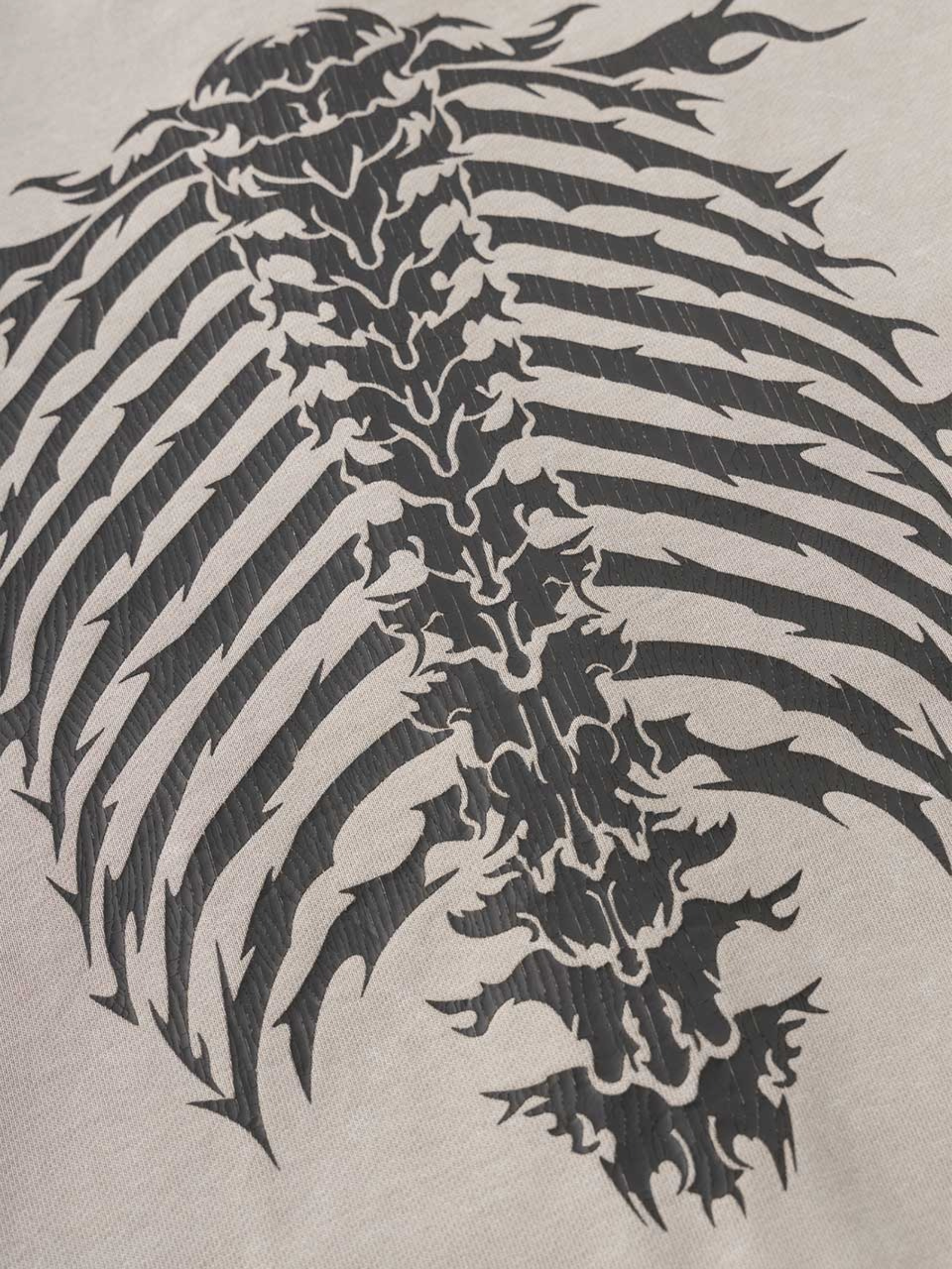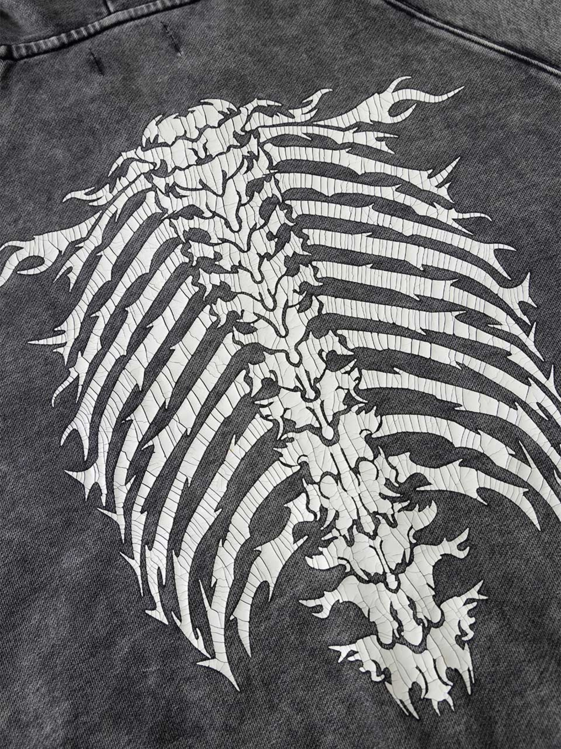 The washed charcoal finish gives it a vintage edge, complemented by bold gothic graphics on the front and a striking spine design across the back. Its oversized silhouette ensures a relaxed, street-ready fit that pairs effortlessly with cargos, denims, or layered looks.
